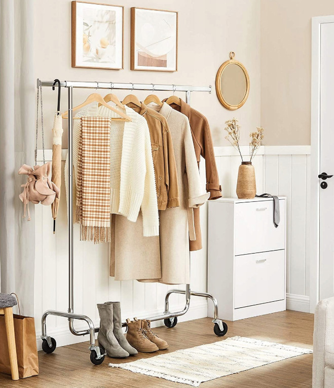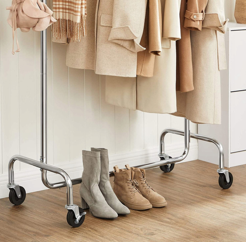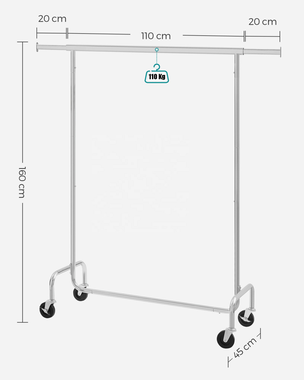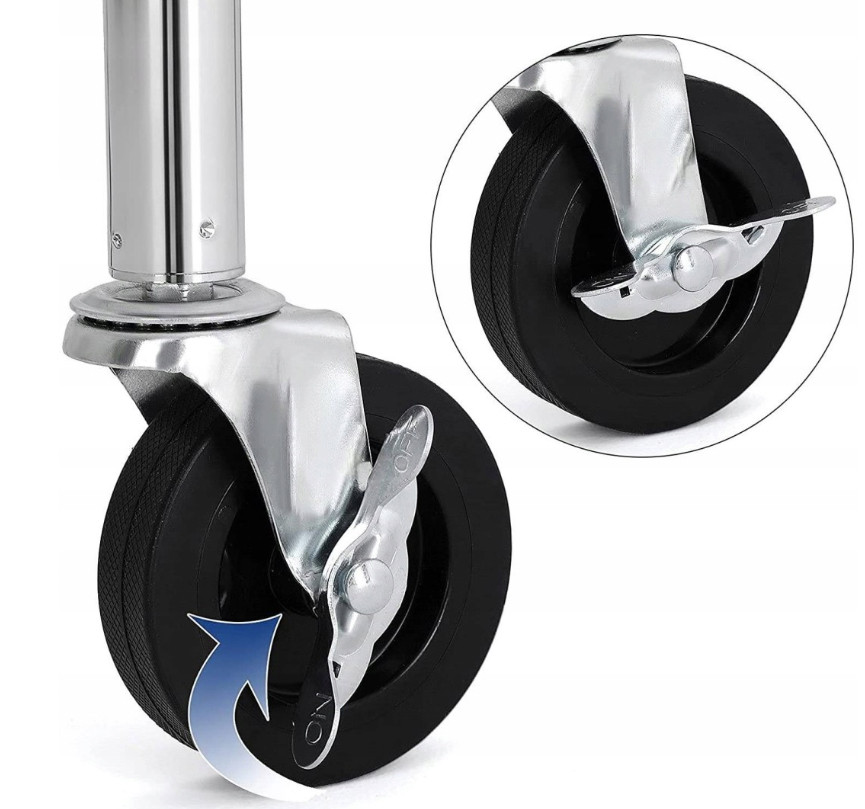 A ruhatartó állvány krómozott fémcsövekből készült, ellenáll a rozsdának, az eróziónak és a karcolásoknak, valamint könnyen tisztítható. A fényes és ragyogó kivitel elegáns és dekoratív megjelenést kölcsönöz otthonának. 4db tartós PP kerék 360 fokban forgatható és 2 fékkel van ellátva, így az egész ruhatartó rúd kényelmesen mozgatható.